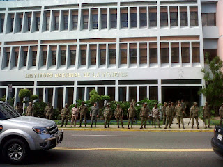 Por ésta actividad cerca 50 militares custodiaban la puerta del edificio del INVI, donde unos 30 jóvenes de diferentes movimientos sociales protestaron contra Alma Fernández y para que se recuperen los apartamentos.